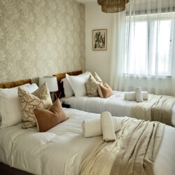 The property features 3 bedrooms (Sleeping 6 people) – 2 x doubles & 1 x single, 1 sofa bed, 3 bathrooms, high-quality hotel-like bed linen, and towels. The double rooms are able to be either king beds or 2 twins.