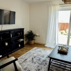 A living room with a smart flat-screen TV with streaming services, a dining area, a fully equipped kitchen, washing machine & dryer and a patio with garden views. Guests can enjoy the tranquil surroundings from the outdoor dining area, and the private entrance ensures added privacy.