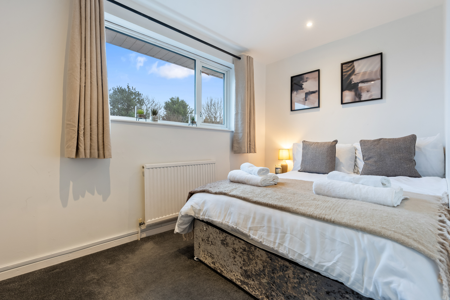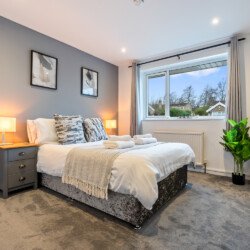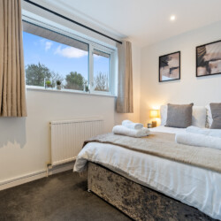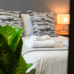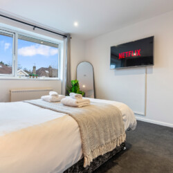 Bedrooms: Our spacious bedrooms, each beautifully designed with its own unique color theme, provide a cozy and welcoming retreat. The first is a large double bedroom featuring built-in wardrobes and a 55-inch wall-mounted smart TV for your entertainment. The second is another comfortable double bedroom, perfect for a restful night’s sleep