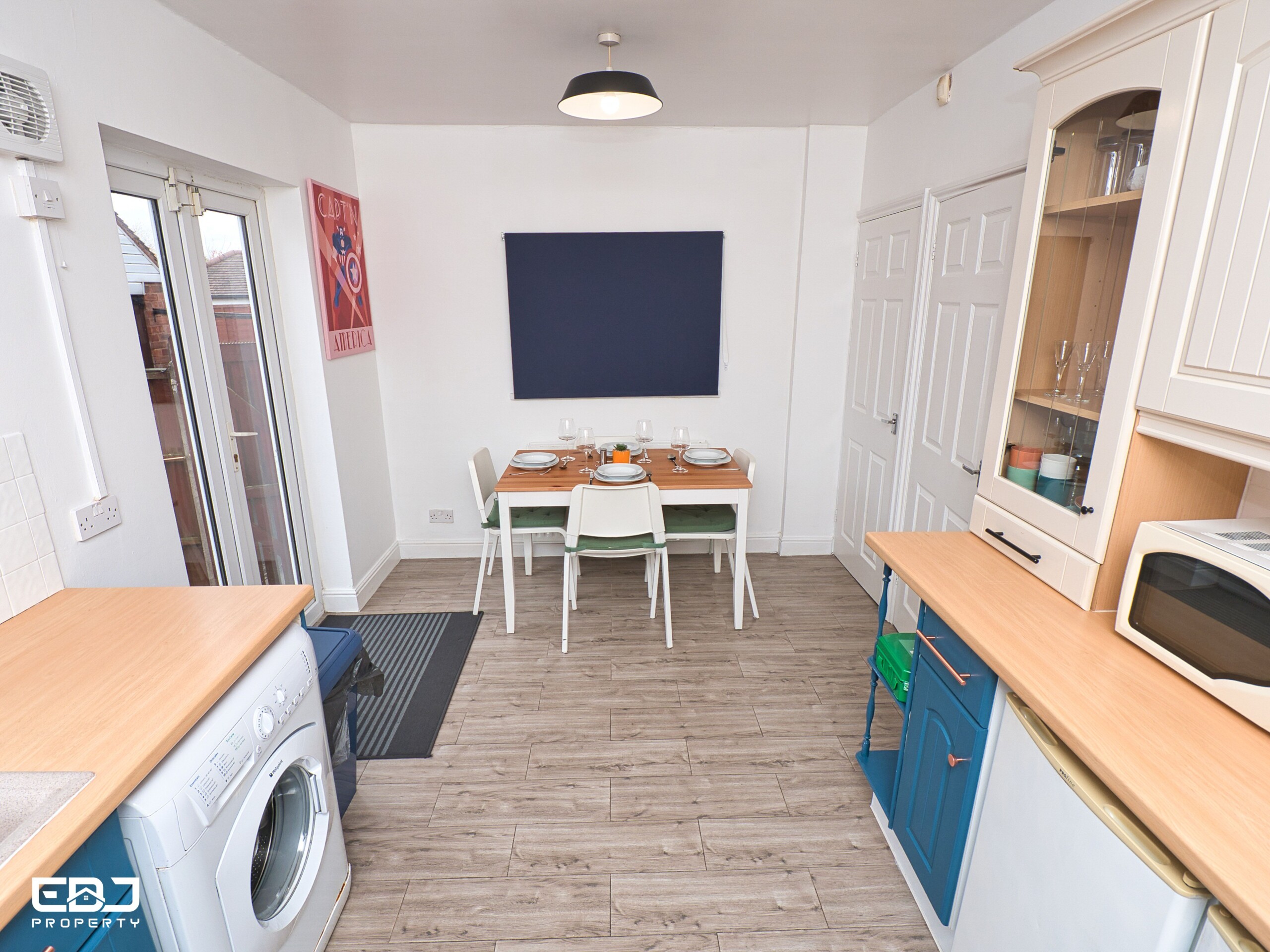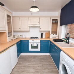 There is a fully operating kitchen/diner with cooker, fridge, freezer, washing machine and microwave with dining table to enjoy meals at.