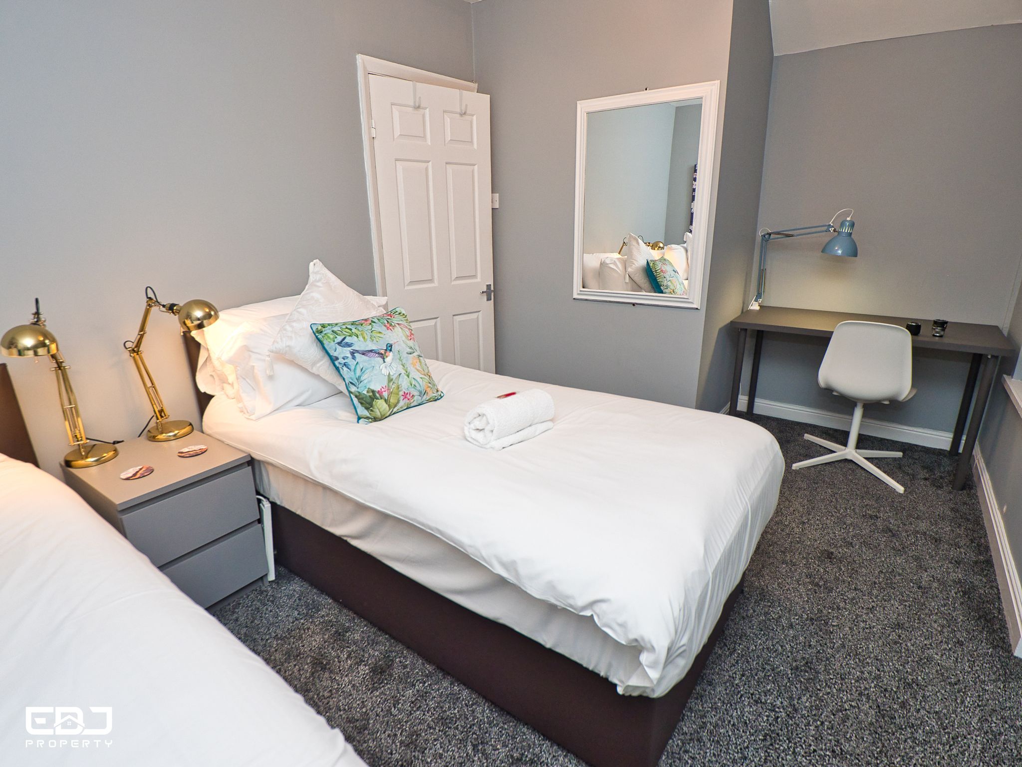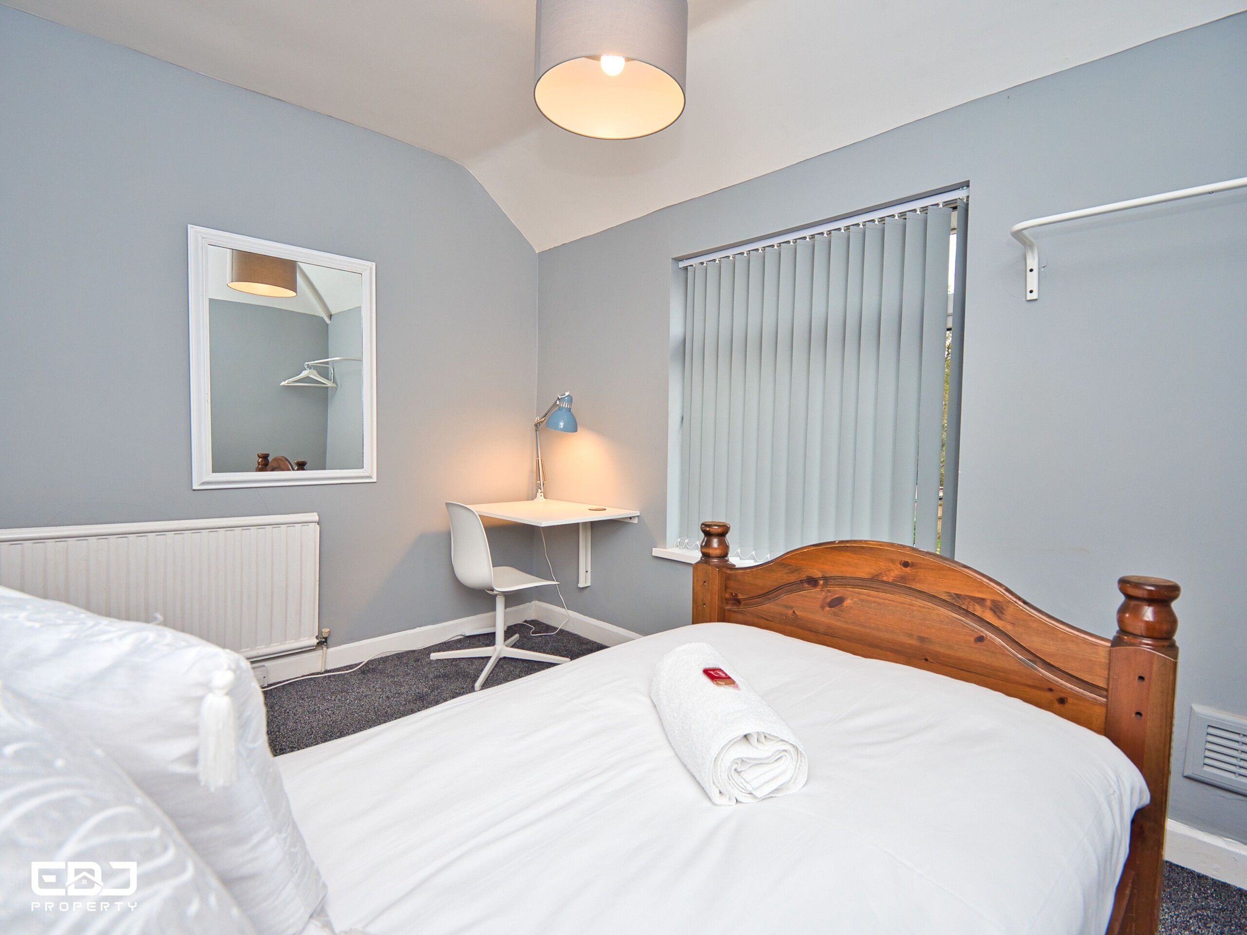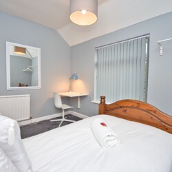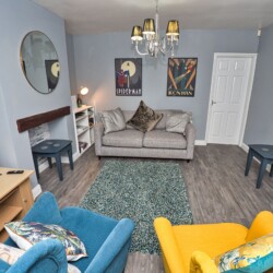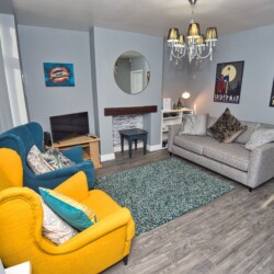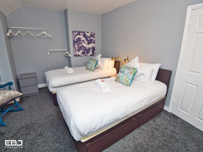The property can sleep up to 4 people as downstairs you will find a lovely Sofology double sofa bed, upstairs a single bedroom and in the main bedroom two singles.