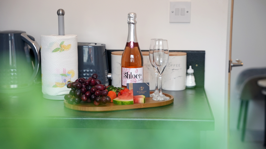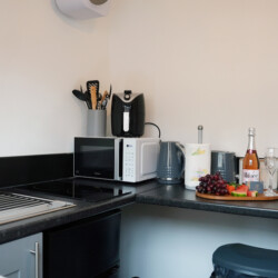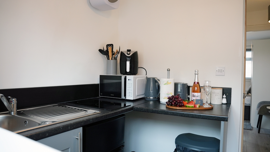Fully Equipped Kitchen: Cook in the fully stocked kitchen, complete with all the essentials, including a microwave, air fryer, fridge, freezer, toaster, kettle, and a full range of utensils and cookware. Perfect for preparing everything from quick breakfasts to gourmet meals.