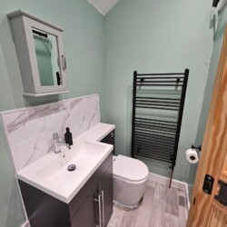 The kitchen is fully equipped with all the essentials, including an electric hob and oven, microwave, kettle, fridge freezer and a selection of kitchen utensils.