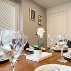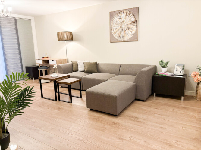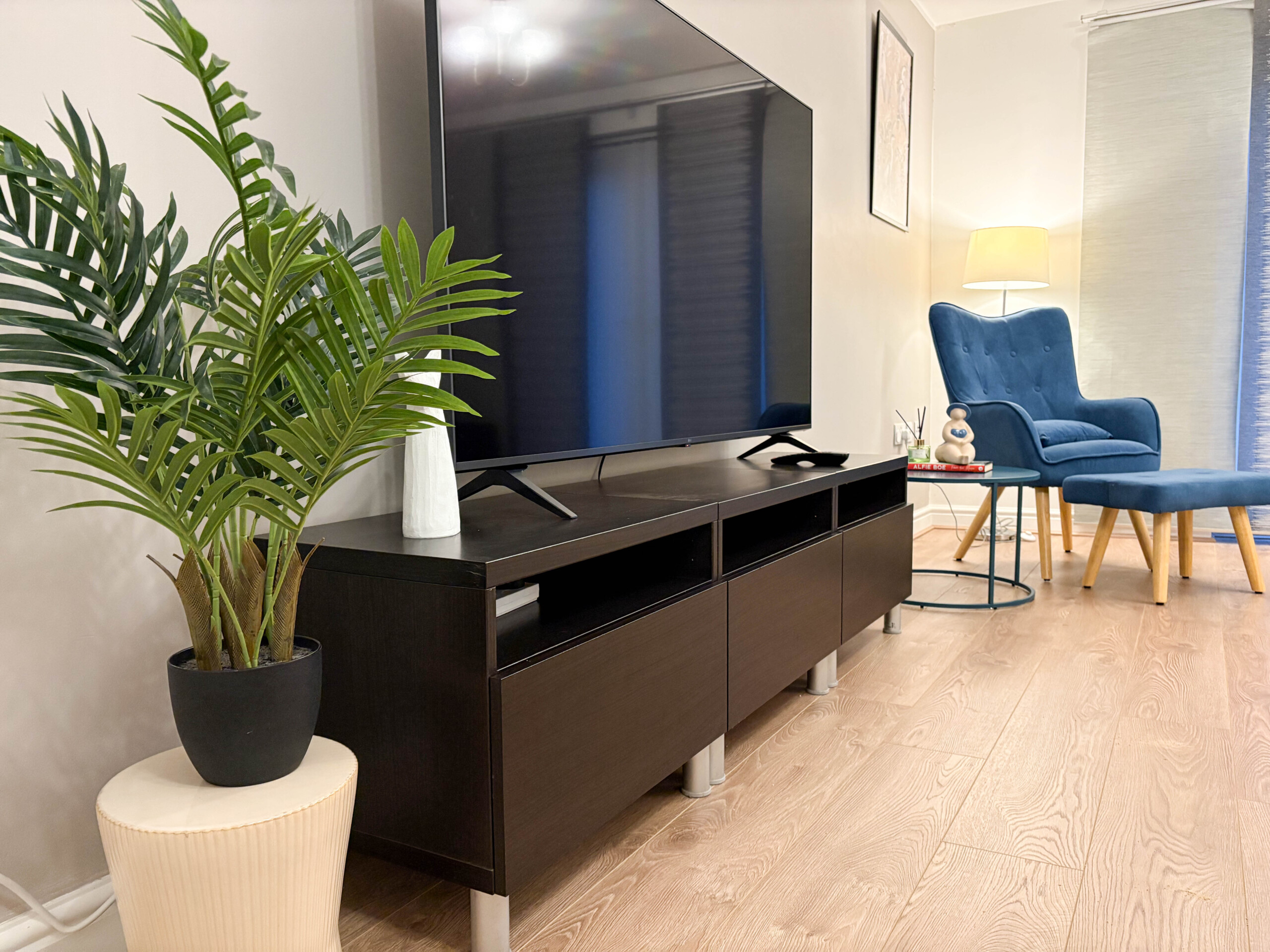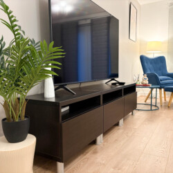 The living room comes with a comfortable upholstery fabric sofa and a wall-mounted large 65″ TV screen comes with Netflix .