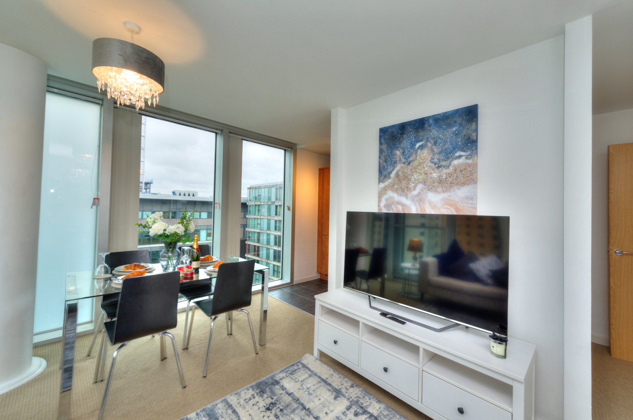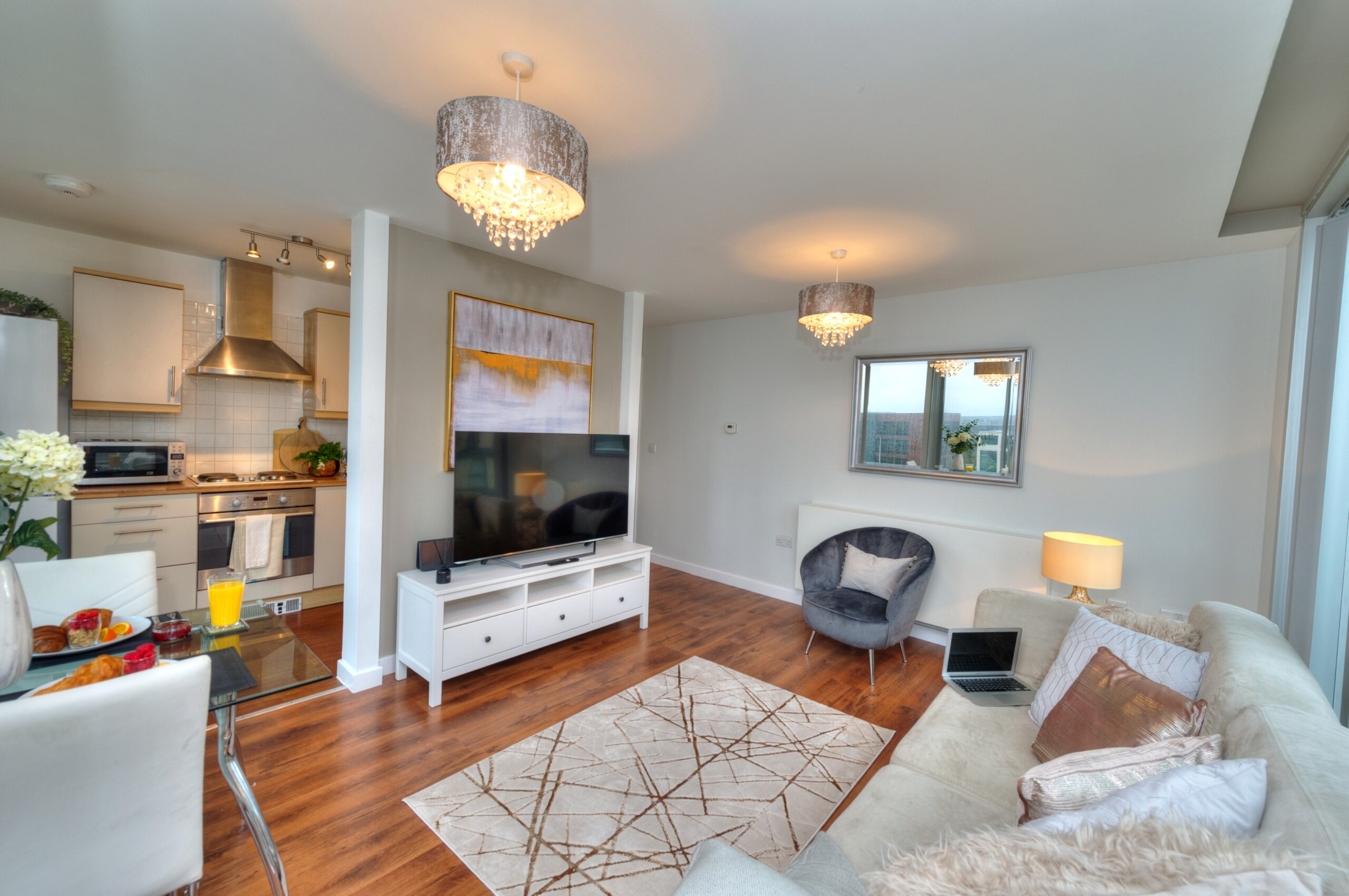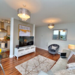 The accommodation comprises of a stunning bright open-plan living room with a flatscreen TV with Netflix and WIFI.