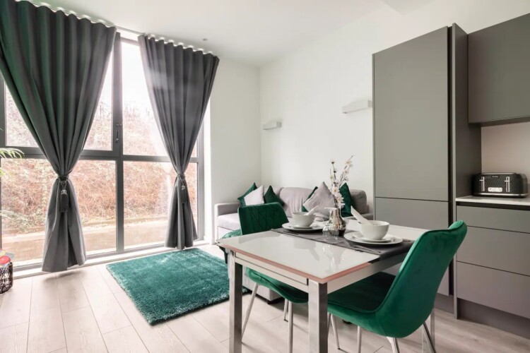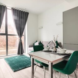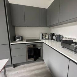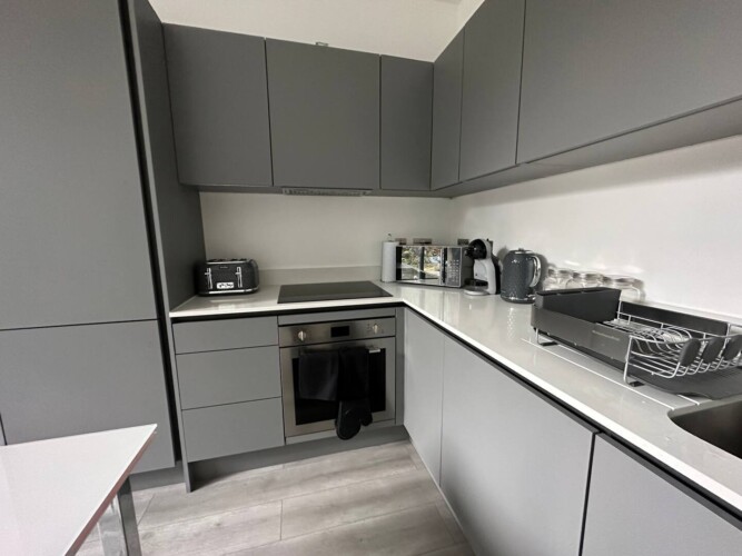 Welcome to our spacious and inviting 1 bed serviced accommodation designed to comfortably accommodate up to four guests. Nestled in the heart of Milton Keynes, this stylishly furnished apartment offers a perfect retreat for both business and leisure travellers. As you step inside, you’ll be greeted by a tastefully decorated living space, thoughtfully designed for relaxation and functionality. The living room features a cosy sofa bed, perfect for unwinding after a long day. Sink into the plush sofa and enjoy your favourite shows on the flat-screen TV, or simply take in the city views through the large windows.