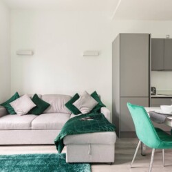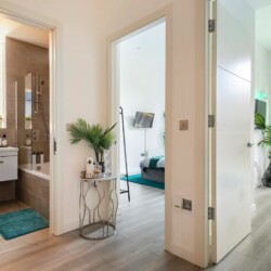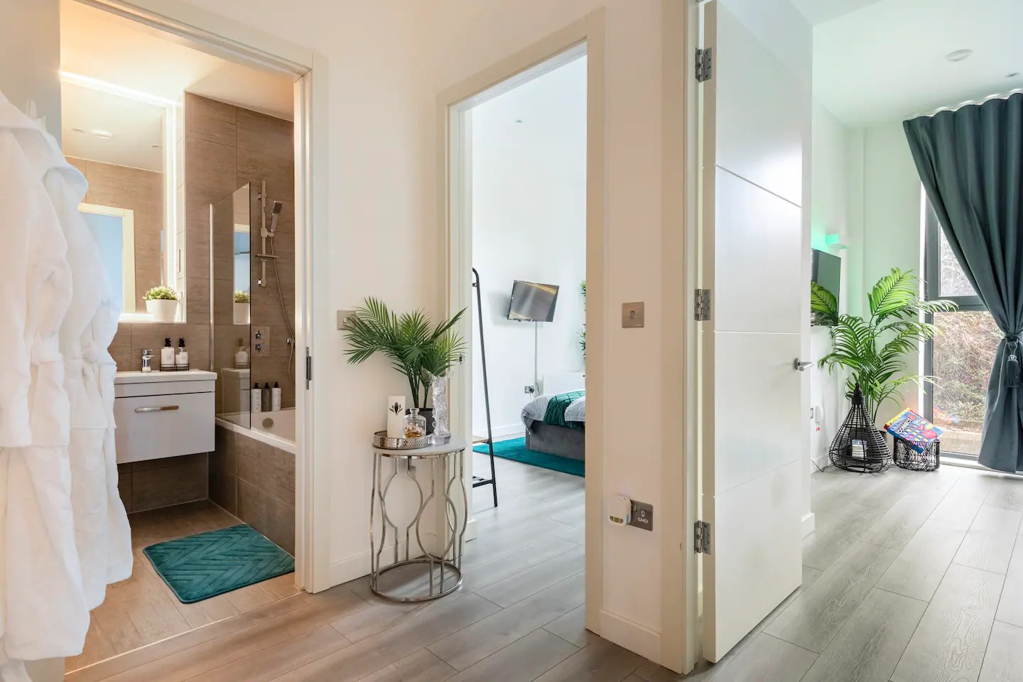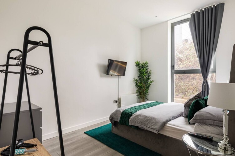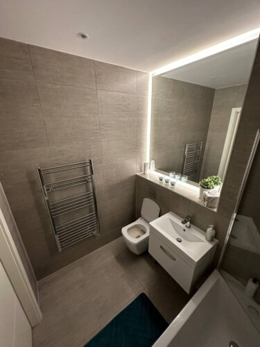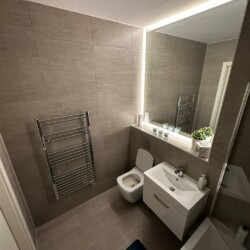 The bedroom is a tranquil sanctuary, complete with comfortable double sized bed and storage space for your belongings. Soft, high-quality lines and pillows ensure a restful nights sleep. For additional guests there’s a sleeper sofa in the living room that easily coverts into a cosy bed. The bathroom offers a refreshing retreat, featuring a modern shower and bath, a vanity sink and a selection of complimentary toiletries. Fluffy towels and a hair dryer are also provided for your convenience. Our 1-bedroom serviced accommodation also includes complimentary wi-fi, air conditioning, and heating to ensure your comfort throughout your stay. For those who need to catch up on work or stay connected, a designated workspace is available in the apartment.