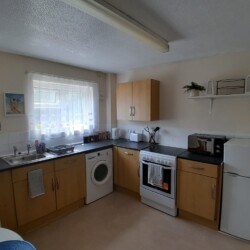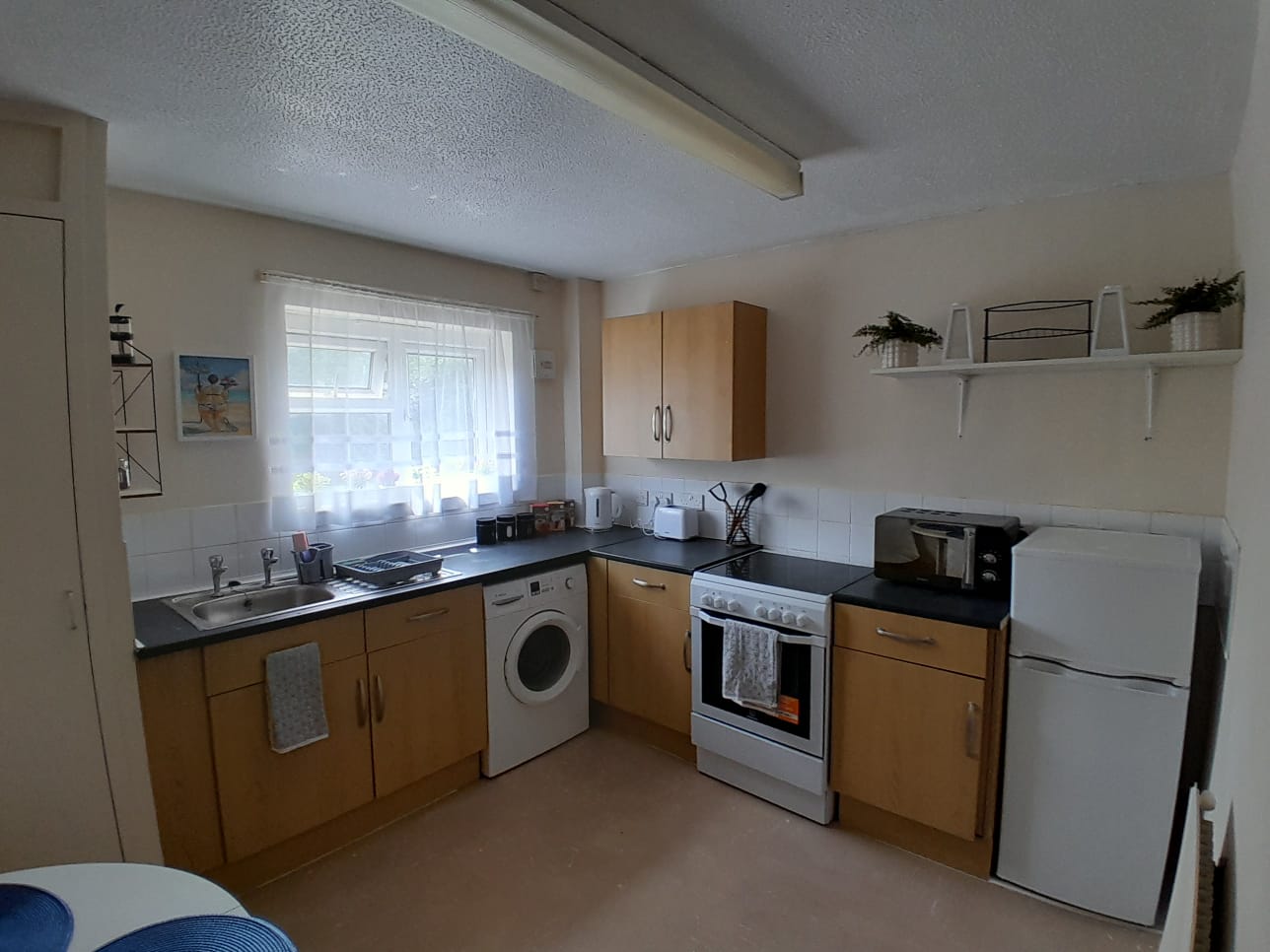 The kitchen has a fridge, a hob, an oven, a kettle, a freezer and a microwave.