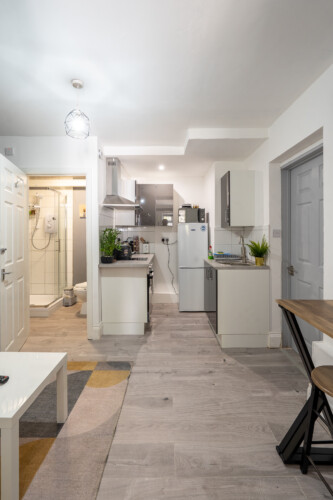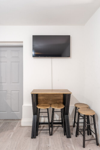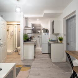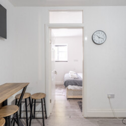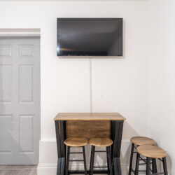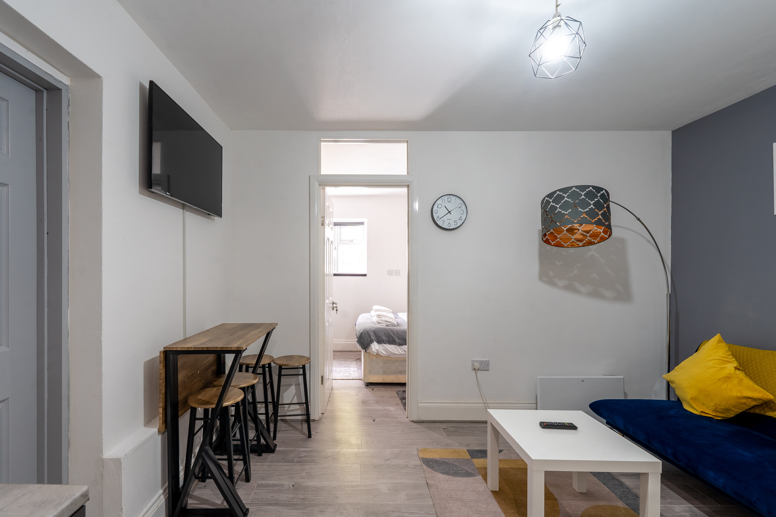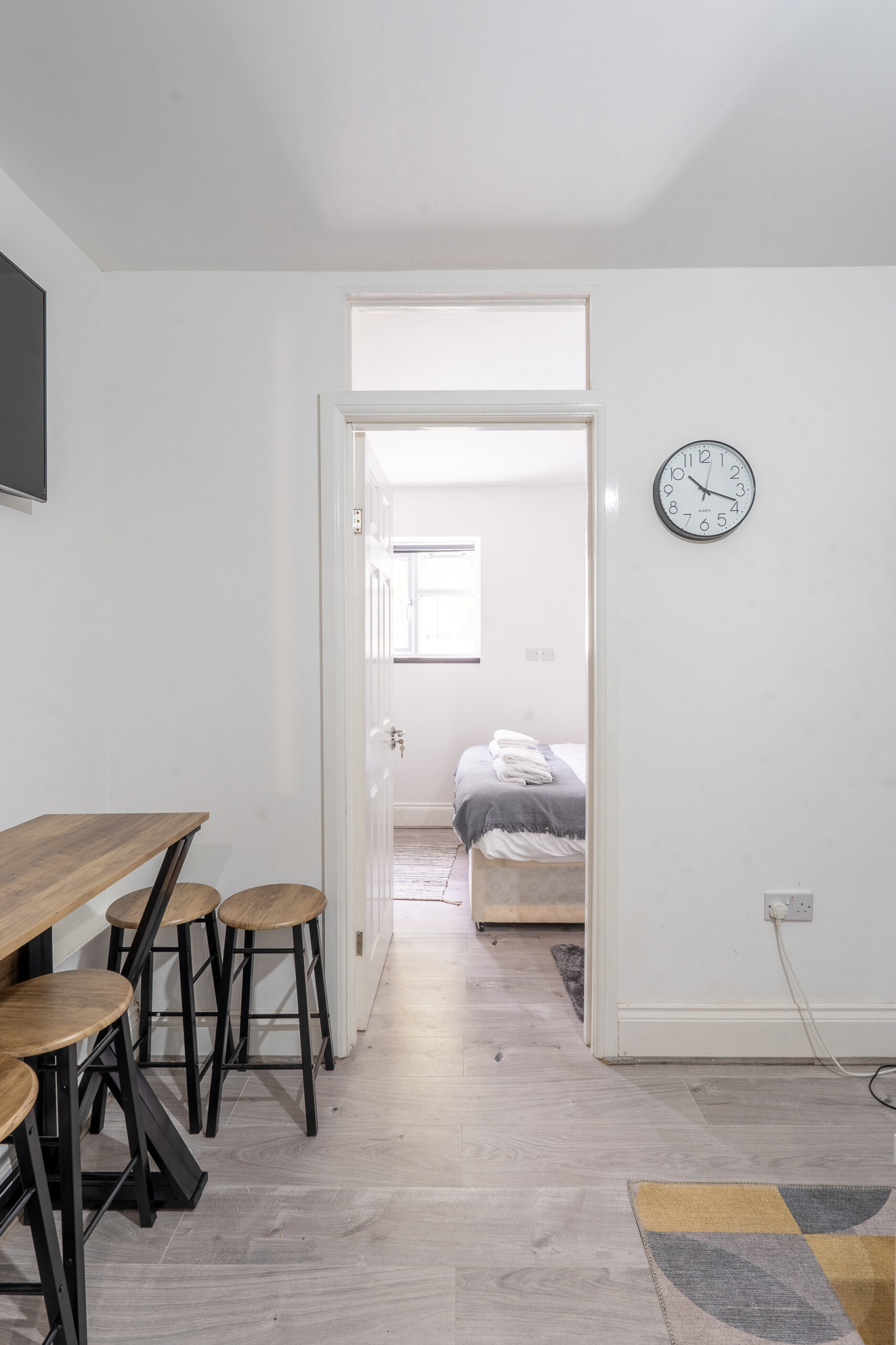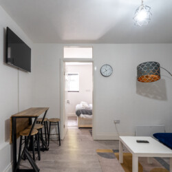 The apartment provides comfortable living space, great to relax and work, in immaculate condition with wooden floors throughout, an open plan living room and kitchen area and comes with Wi-Fi, and coffee facilities, a dining table which converts into a breakfast bar/working area. A fully equipped kitchen with pots and pans, chopping board and most cooking essentials, speciality oils, salt and pepper, storage space, hairdryer, iron, and ironing board. Guests can have access to the apartment via the key-safe in the porch by the front door, using the keys provided.