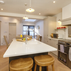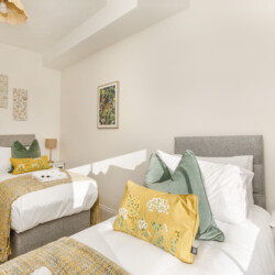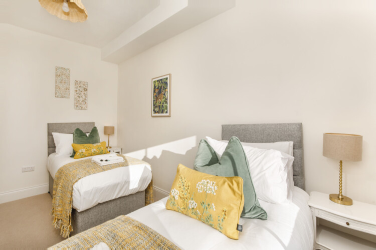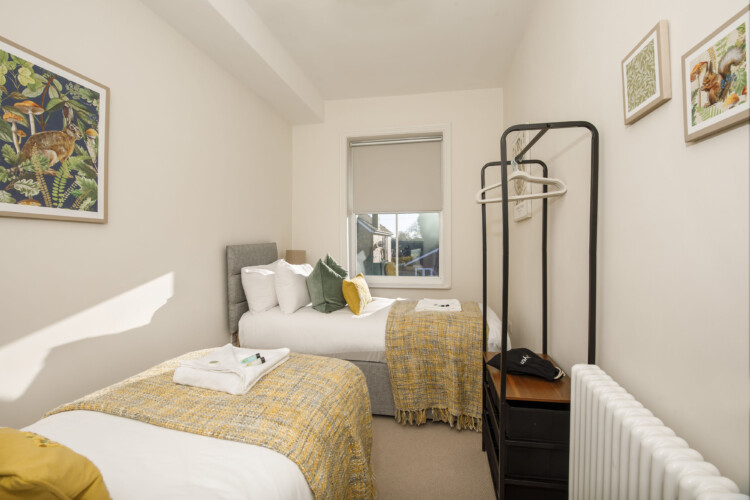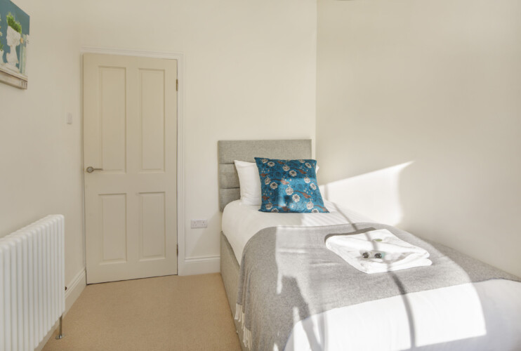 The house features three well-appointed bedrooms, accommodating up to five guests comfortably. One of the bedrooms is equipped with a zip-link bed, allowing for flexible sleeping arrangements depending on the groups needs. This bed can be set up as a king-size bed or two single beds, providing adaptability for different team requirements. The second bedroom is furnished with two single beds, making it ideal for colleagues who need separate sleeping spaces. The third bedroom has a single bed, offering a private retreat for an individual guest. Each room is designed with a calming color palette and high-quality mattresses to ensure a restful nights sleep.