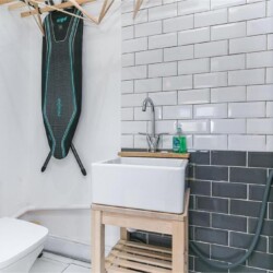 We have a coffee/seating room alongside our half bathroom/utility closet. This has a washer and dryer for our guest’s use along with a drying rack and iron board if needed.